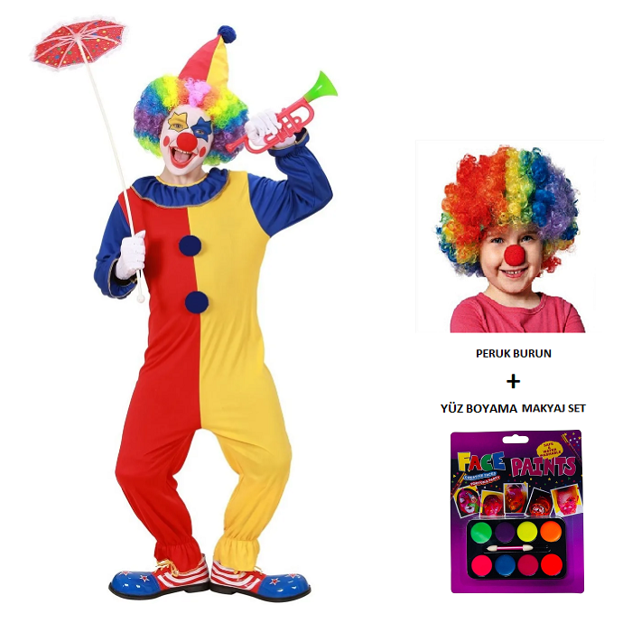 Kukuletalı Tulum Palyaço Kostümü Çocuk Tam Takım