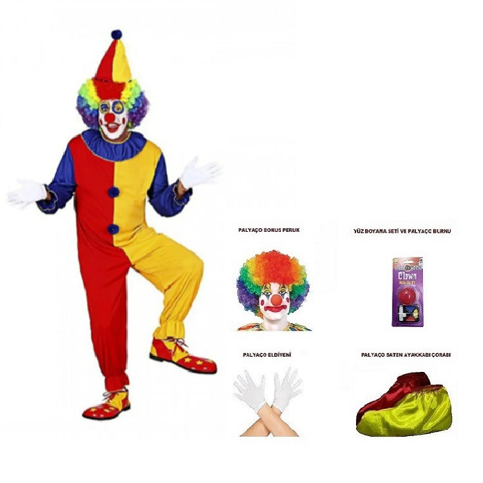Kukuletalı Tulum Palyaço Kostümü ve 5 Parça Gösteri Seti